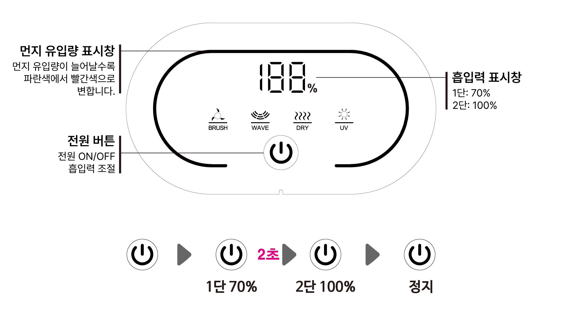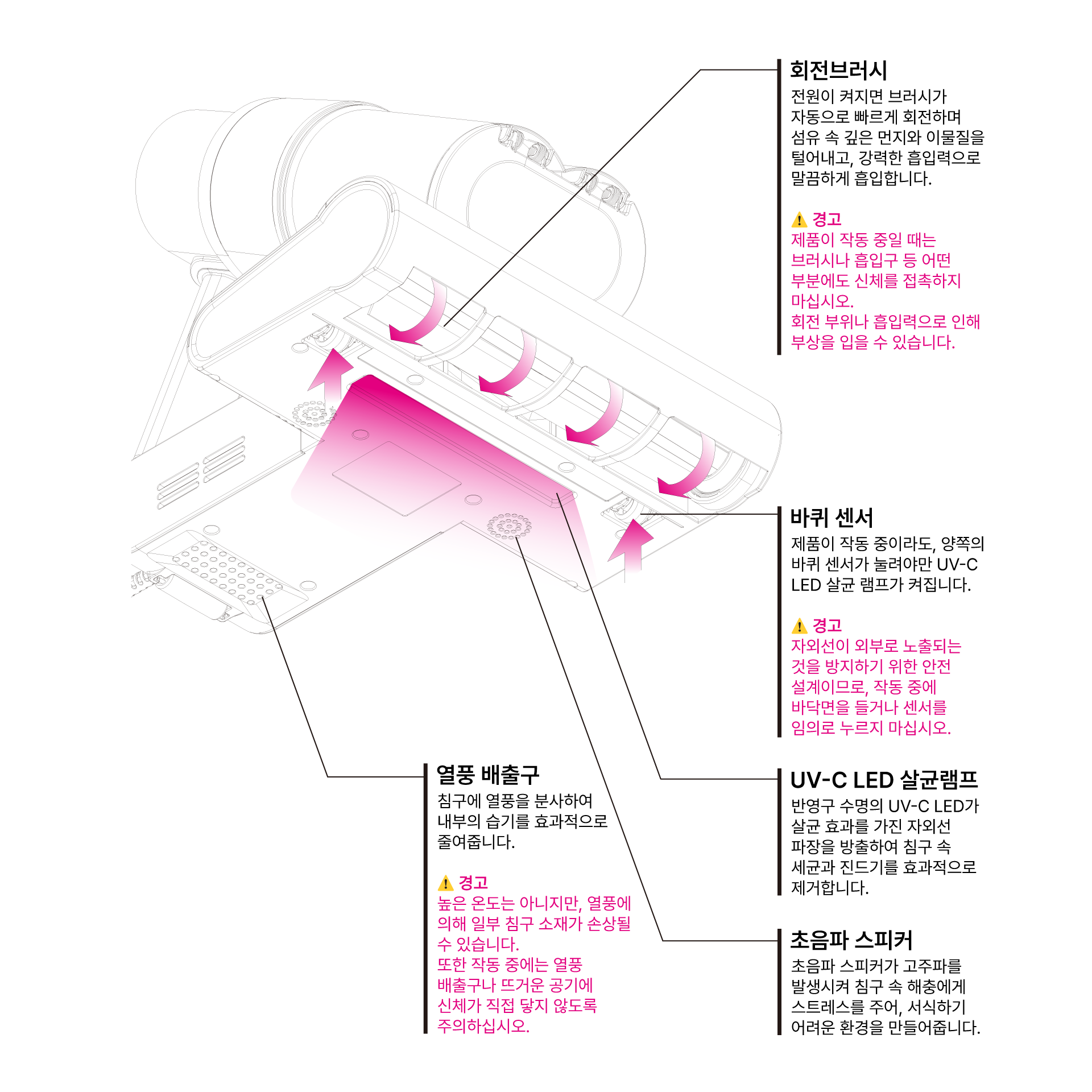 본 제품은 흡입, 회전브러시, UV-C LED 살균램프, 초음파 스피커, 열풍 기능이 동시에 작동합니다.